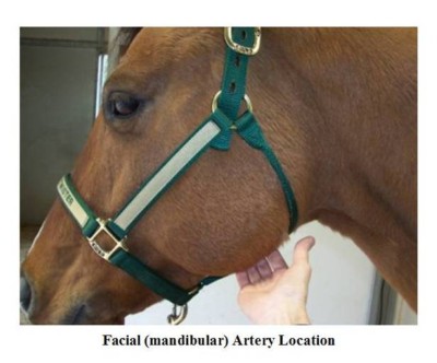 Quick - what's the average resting pulse rate of your horse? You may know the normal resting pulse rate of an adult horse is between 25 and 50 beats per minute (bpm), but what is your horse's rate? Because of the wide margin of normalcy, the resting pulse rate for individual horses should be recorded. The pulse is one of the three vitals signs taken to check the condition of the horse's health. The other two are the temperature and respiration rate. An abnormal resting pulse rate can signify infection, dehydration, stress, pain and an erratic heart beat. The pulse must be taken when the horse is calm and resting. Do not try to get an accurate reading when there is a lot of activity in the barn; just before feeding time or after exercise. Don't make a big production of it - stay calm and keep the horse quiet. The pulse should be taken at the same time every day for five days. Make a note of each reading and average them. To get an average, add the results of the five days and divide the answer by five: the answer is the average normal pulse for that horse. The easiest way to check a horse's heart rate is to use a stethoscope and listen to the heart. Place the stethoscope on the girth area just behind the left elbow. The heart makes two sounds, lub then dub, which counts as a single beat. Count the number of beats that occur in 15 seconds. Multiply that by four and you'll have your horse's resting heart rate per minute. *Hint - most watches no longer have second hands, so I use the timer on my phone. You should also know how to manually take the pulse. In order to do this you have to find where an artery is close to the surface. There are several locations, but the easiest to find is under the jaw. Stand on the left side of a haltered horse; hold the lead shank with your left hand and use your right hand to locate the pulse. You are trying to find the facial (mandibular) artery. Use the fingers of your right hand and feel along the inside of the lower jaw. The artery will be in the vicinity of the last cheek tooth - inside the jawbone. When you reach the right location you'll feel a cord-like shape. Press that structure lightly against the jawbone - you should detect the pulse. You need to exert some gentle pressure, just touching the skin will not be enough. |