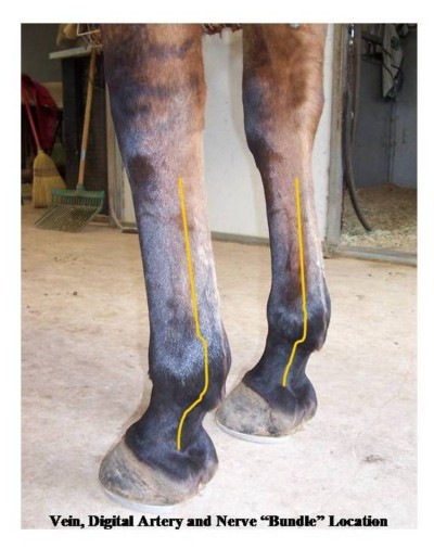 but are on each "back edge". If you get too far forward you may confuse the bundle with the suspensory ligament branch. The ligament is toward the center of the pastern, when looking at the leg from the side. It will feel hard and not have a pulse. When searching for the artery you'll have to apply light pressure. It will be hard to detect by just touching the surface. When you find it you'll feel the cordlike bundle under your fingertips. Using light pressure, concentrate and try to feel the pulse; don't press too hard or you'll stop the blood flow and there will be nothing to feel. The pulse will be very light in a healthy horse. If the horse has a bounding pulse, it will be easy to detect and you'll need to consult a veterinarian. Learn how to detect the digital pulse on all four legs. Just checking one leg won't rule out a problem with one of the other hooves. Also a normal heart rate detected with a stethoscope or checked under the jaw will not rule out a foot problem. |