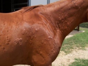 sizes, with the largest about the size of a nickel. He had been fine the night before. Sport wasn’t in any distress, but the victim of an allergic reaction to something which was resulting in the hives. Hives, also known as urticaria, is the body’s reaction to the presence of high levels of histamine in the blood. Histamine helps the body fight allergies or foreign invaders like germs and non-beneficial bacteria. Unfortunately the side effects of high levels of histamine can be hives, nasal congestion and itchy, watery eyes. Determining the cause of hives can be difficult. There are instances when something will come to mind – a change of feed, new fly spray, medication, new bedding or the presence of biting insects. In Sport’s case nothing had changed. He was in the same pasture, eating the same feed, he had not been off the ranch and the bugs were not any worse than usual. His fly spray was not new and he hadn’t been treated with any medications. Luckily Sport was not showing any signs of discomfort. He wasn’t scratching or in pain. This is not always the case. Many horses that contract hives also have skin irritation. They will rub themselves raw to get relief from the itching. In some instances horses may have fevers, lose their appetite or become restless or dull. Not being in distress we decided to just watch Sport for the next several days. Many times hives clear up without intervention. Sport’s owner arrived and rinsed him off with cool water. It was possible something in the air triggered the allergic response. For horses having discomfort due to hives the veterinarian can prescribe an antihistamine. Antihistamines block or reduce histamine – reducing the side effects. By late afternoon Sport’s hives were gone – never to return. What caused them? We have no clue. It’s a mystery - another strange thing to be documented in our life with horses. |