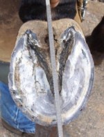 Hooves and Pain By Eleanor Richards Copyright©2008 There she stood - with her head in the stall corner. She was fat, shod badly; the joints and pasterns on all four legs were swollen and she laid back her ears when approached. When we watched her being ridden, prior to the auction, she was nasty and sour. So we bought her. Babe also had a pretty head and under all that fat was a nicely balanced horse. The first step toward fixing her was to pull her shoes. Babe is 15.2 hands and a large mare. She was wearing double ought shoes (00) - shoes meant for a smaller horse. Her heels were contracted and the shoes provided no heel support. Because of a long history of wearing shoes too small Babe's hooves were twisting…rolling under. Using a shoe too small for a horse does not allow the hoof to expand so it begins to twist - looking for the path of least resistance. Soon the hoof becomes unbalanced. When looking at the bottom of Babe's hoof there was more growth to the outside. The frog was twisted - pointing to the inside. Left rear The small shoes did not provide heel support either. Because of the unbalanced hoof her weight was not centered over the hoof. Instead she was rocked back on her heels. She was compressing her heels and accelerating the contracted heel problem. Previous horse shoers had been removing needed heel and allowing the toe to push forward. It would take a year or more to correct the problem and we hoped it was not too late. A size two shoe was used. The shoe's heels extend under the bulbs of her feet, in order to support her weight. Only three nails were used. The heel nail is skipped to allow expansion. Babe was also showing tremendous body pain. Just brushing her made her lay back her ears and move away. She was especially sore in the stifle, hip and hamstring area. The unbalanced hooves were taking a toll on her body. During exercise she had trouble with her stifles. She would buckle during the lope and lateral movement was restricted. I contacted Betty Lindquist, who teaches the online course Equine Massage for www.horsecoursesonline.com. I enrolled in the course and with Betty's advice I started massaging Babe. The course also gave me exercises to improve suppleness and muscle strength. I also used a product which contains arnica during the massage. Arnica is a perennial plant that is used in homeopathic muscle ointments. In the beginning Babe could barely tolerate being touched. Each session showed improvement and her range of motion improved during light daily exercise. Babe was also put on a diet - much to her dismay. Because I believe in keeping forage in front of horses at all times her fiber intake was not decreased. Her forage was changed from alfalfa hay to coastal Bermuda grass hay. Babe was put on a low calorie, balanced vitamin/mineral supplement. It's been five months since the auction and Babe shows improvement daily. We had two periods of intense soreness as we learned exercise limits. Her body became strong with work. Along the way I was given some poor advice…especially in regards to the stifle problem. I was told to work her in deep sand; and have the medial patellar ligament cut (which would not allow her to rest her hind leg while dozing any longer). Both of these methods are used by people wanting immediate results. Neither addressed the improper hoof balance, the bad diet and the lack of exercise or general well-being of the horse. Veterinarians wanted to do radiographs, ultrasound, and magnetic resonance imaging (MRI) - none of which would have cured the problem - just made me poorer. I knew when considering Babe's purchase that she had problems, but I was also pretty sure they could be fixed - with persistence, patience and education. Babe has shown improvement quickly. It was not overnight, but it has been surprisingly rapid. There's a new horse in the barn and her future looks bright. Eleanor and Babe Copyright©thewayofhorses Eleanor Richards |